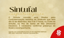O Sintufal convida seus filiados para Confraternização Natalina do Sindicato que será dia 22 de dezembro, das 11 às 17 horas, no Clube do Sintufal, na Ilha de Santa de Rita (Marechal Deodoro). Será um dia para rever amigos e se divertir ao som de música ao vivo com churrasco, cerveja e refrigerantes.